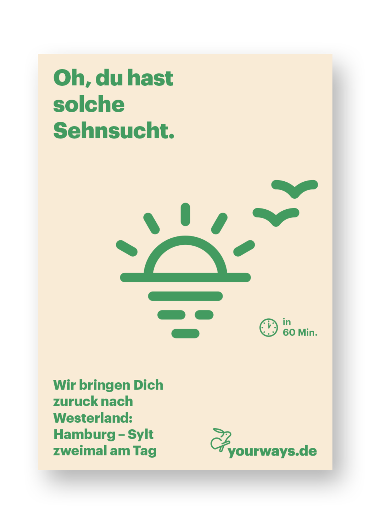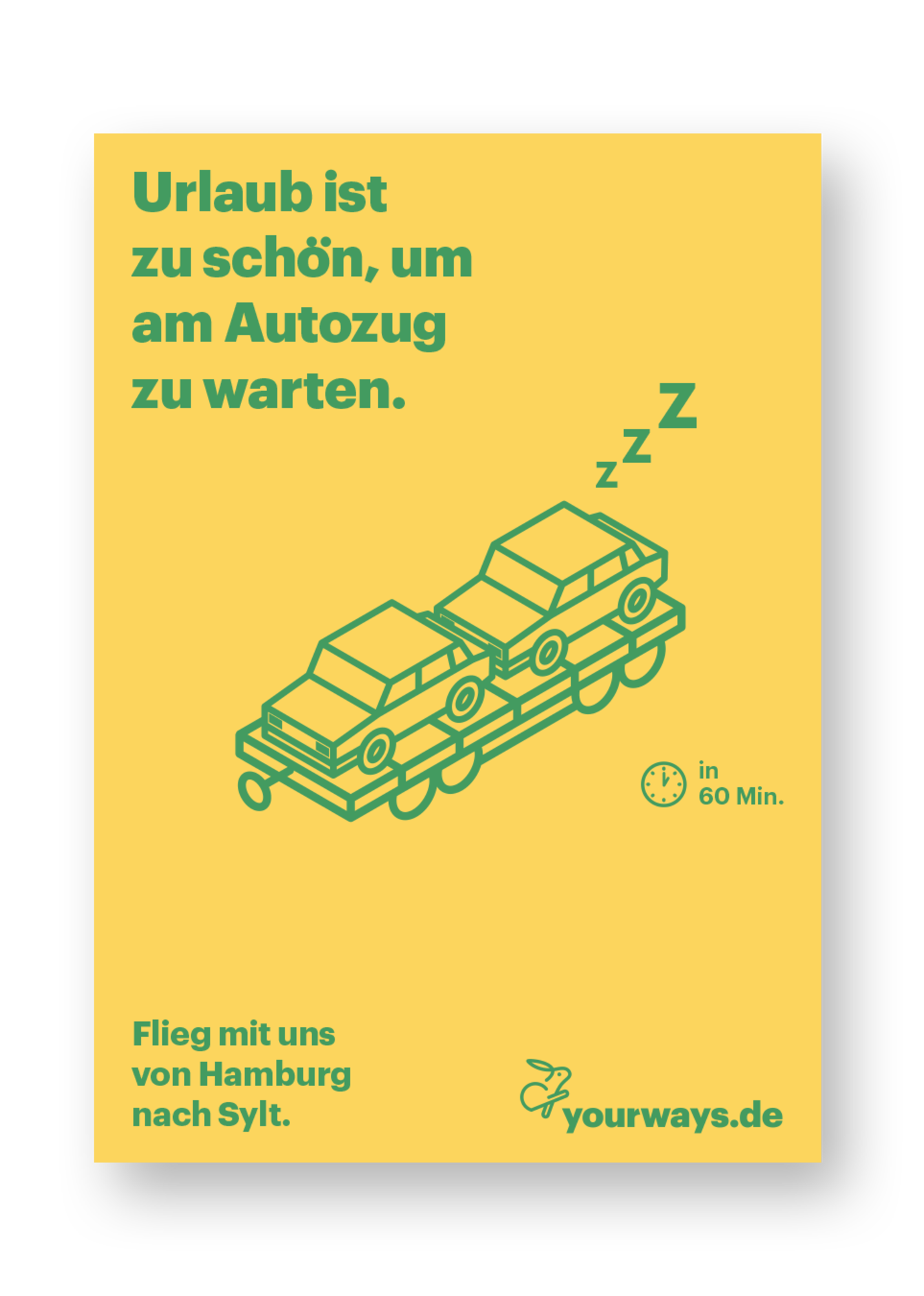 Der Urlaub beginnt für die meisten in dem Moment, in dem sie im Auto sitzen. Allerdings täuscht dieses Gefühl, denn gerade die Zug- und Fährverbindungen nach Sylt sind oft überlastet und stressen einen Auto- oder Bahnfahrer mehr, als der Kurzurlaub Erholung bieten kann. yourways sollte genau an dieser Stelle Abhilfe schaffen, indem sie sich um eine entspannte und sorglose An- und Abreise kümmern und sich als Fluchthelfer für Kurztrips positionierten.